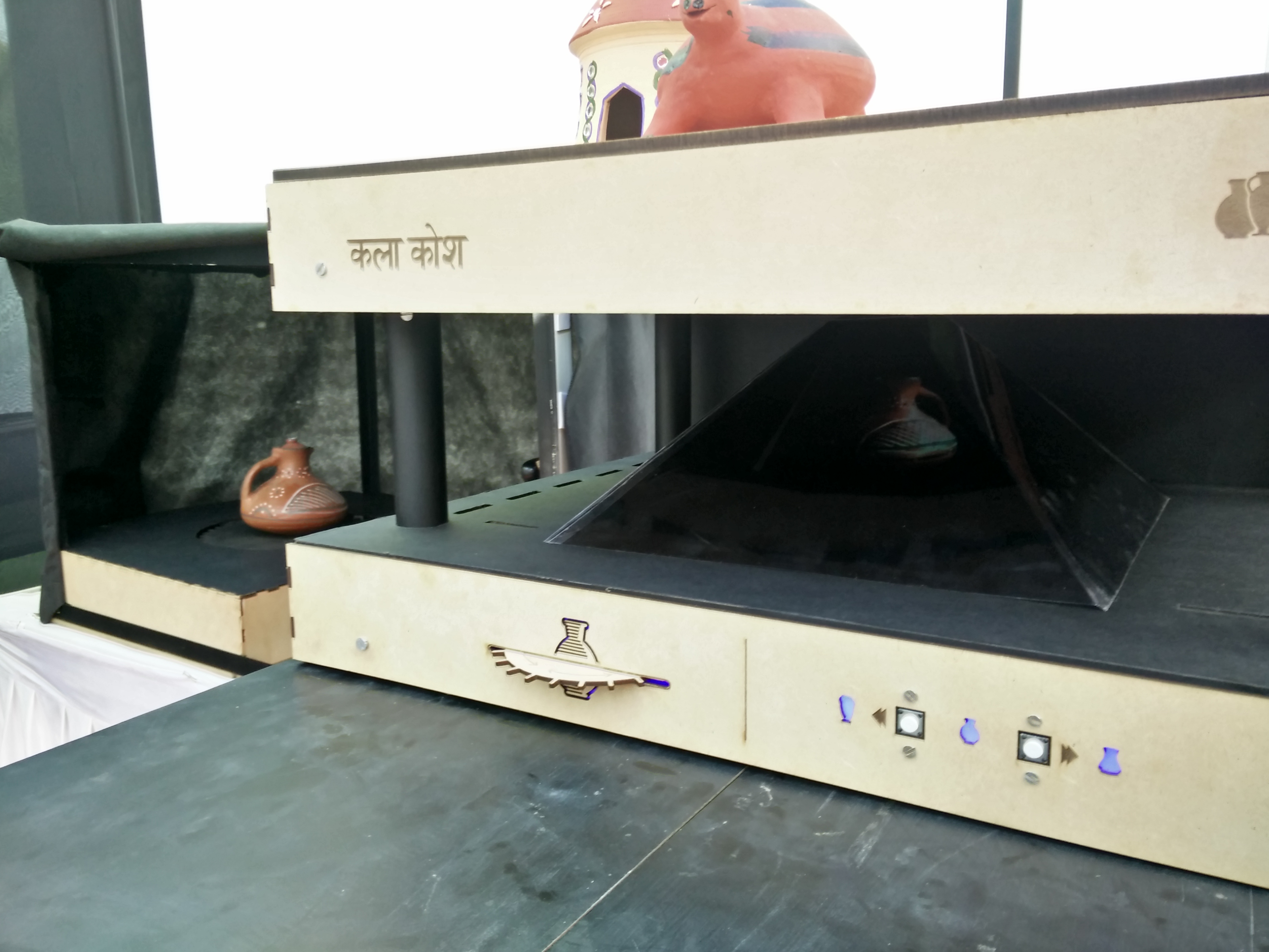 Entire concept of Kala Kosh was developed using open source tools, digital fabrication, holographic display & custom built 3d scanner and setup. This project is still in development stage and will soon be launched on open source platform so it can be used by any other craft cluster in India.